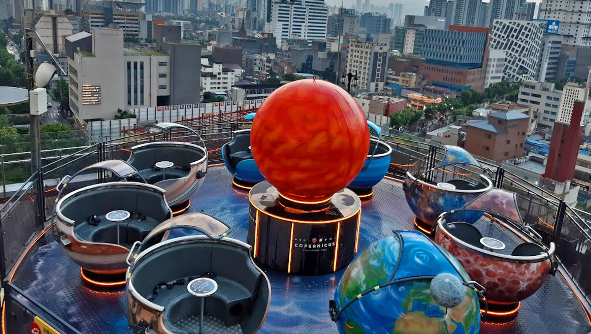 This family ride makes for a journey into space where kids (and parents) sit together in planet-shaped cars that revolve around the central sun-shaped element while moving up and down. As an option, the ride can be equipped with an audio system producing space sounds and the park can choose to work with VR-goggles to provide extra info.