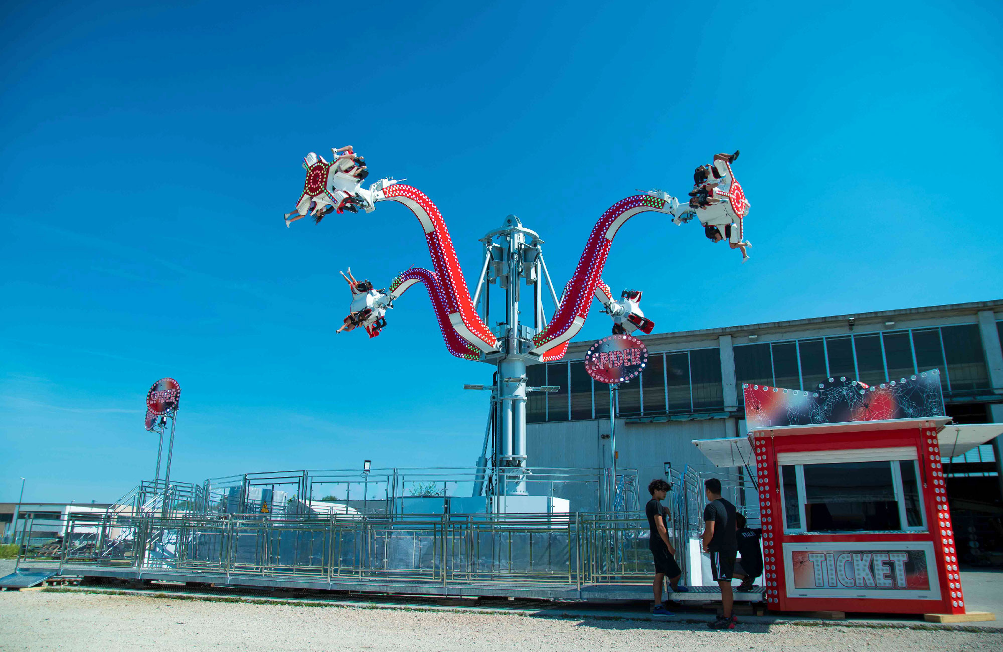 Spider is a new exciting major/family ride. The ride has a main central column onto which 4 arms are attached; each arm holds a 4-passenger car. Riders are lifted up to a height of 12 meters. The ride can be delivered with or without platform.